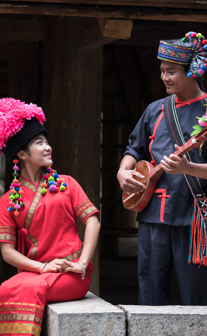 云南壯族主要聚居在文山州,人口114萬,民間的村寨大多依山傍水。壯族擅長種植水稻,有太陽崇拜和長老崇拜的風(fēng)俗,視銅鼓為重器,厚愛銀飾,善烹制五色花米飯,能歌善舞,熱情好客。進(jìn)入景區(qū)壯族村,迎面有祭祀龍王的龍柱,兩邊是先民繪制的天王崖畫和為紀(jì)念傳說洪水泛濫時幫助先民度過劫難而建的石葫蘆亭。祭祀玉皇大帝的昊天閣和傳說能驅(qū)邪納福的碩大銅鼓聳立在廣場兩側(cè)。桿欄式和麻欄式民居、壯族青年社交休憩的“情廊”、村...